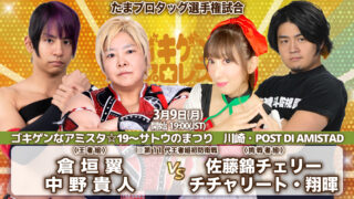 「ゴキゲンなアミスタ☆19〜サトウのまつり」 3月9日(月)川崎・POST DI AMISTAD 19時 【決定カード】 ▼たまプロタッグ選手試合 〈王者組〉倉垣翼&中野貴人vs佐藤錦チェリー&チチャリート・翔暉〈挑戦者組〉 ※第11代王者...