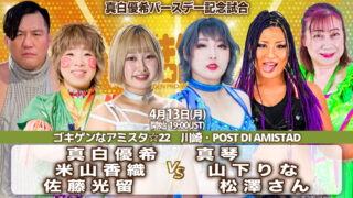 「ゴキゲンなアミスタ☆23」 4月27日(月)川崎・POST DI AMISTAD 19時 ▼ゴキゲン6人タッグマッチ くいしんぼう仮面&SAKI&三二一ちゃんvs佐藤光留&ソイ&松澤さん ▼タッグマッチ 米山香織&関口翔vs真琴&美蘭 ▼...