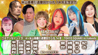 ニュース ◎ゴキゲンプロレス12・23インイタ/決定カード&参戦選手 「ゴキゲンなインイタ☆4〜米山香織引退撤回から丸14年」12月23日(火)TOKYO SQUARE in Itabashi 19時半 ▼米山香織引退撤回から丸14年記念試合米山香織&佐藤光留&真霜拳號&松澤さんvs宮崎有妃&世羅りさ&優宇※... 2025.11.24 ニュース