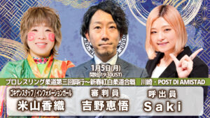 「プロレスリング柔道第三回興行〜新春紅白柔道合戦」 日時:1月5日(月)FC先行入場19:00 開場19:10 開始19:30 会場:川崎・POST DI AMISTAD 住所:神奈川県川崎市幸区中幸町3-16-1(1階) 交通:JR川崎駅...