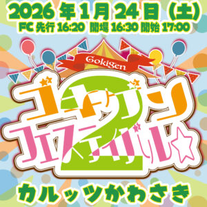 「ゴキゲンフェスティバル☆2」 日時:1月24日(土)FC先行入場16:20 開場16:30開始17:00 会場:カルッツかわさき 交通:JR「川崎駅(北口東)」京急「京急川崎駅」より徒歩約15分 料金:正面最前列席10,000円、最前列席...
