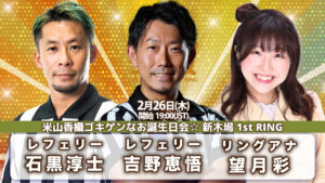 「米山香織ゴキゲンなお誕生日会☆」 日時:2月26日(木)FC先行入場18:20 開場18:30 前説18:50 試合開始19:00 場所:新木場1st RING 住所:東京都江東区新木場1-6-24 交通:東京メトロ有楽町線・JR京葉線・...
