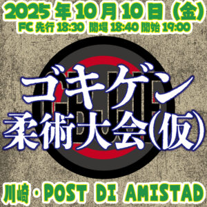 「ゴキゲン柔術大会(仮)」 10月10日(金)川崎・POST DI AMISTAD 19時 〈決定カード〉▼ゴキゲン柔術マッチ(仮)石黒淳士vs勝村周一朗 ▼ゴキゲン柔術マッチ(仮)関根“シュレック”秀樹vs KURO-OBI ▼ゴキゲン柔...