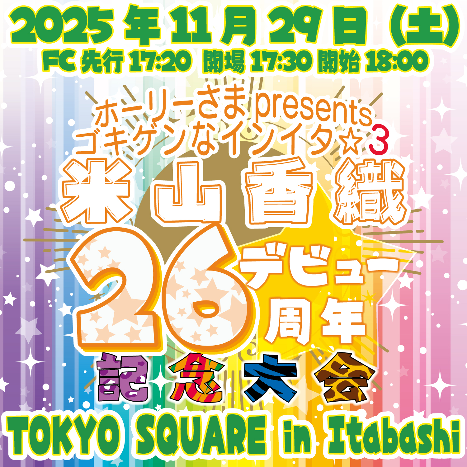 「ホーリーさまpresentsゴキゲンなインイタ☆3〜米山香織デビュー26周年記念大会」 11月29日(土)TOKYO SQUARE in Itabashi 18時 17:00 当日券発売 17:40 FC先行入場 17:30 開場 18:...